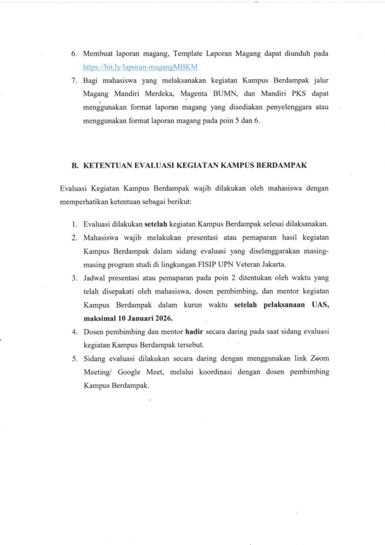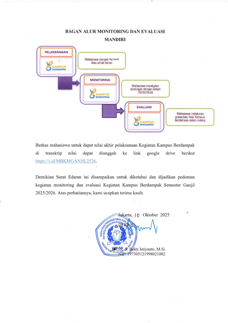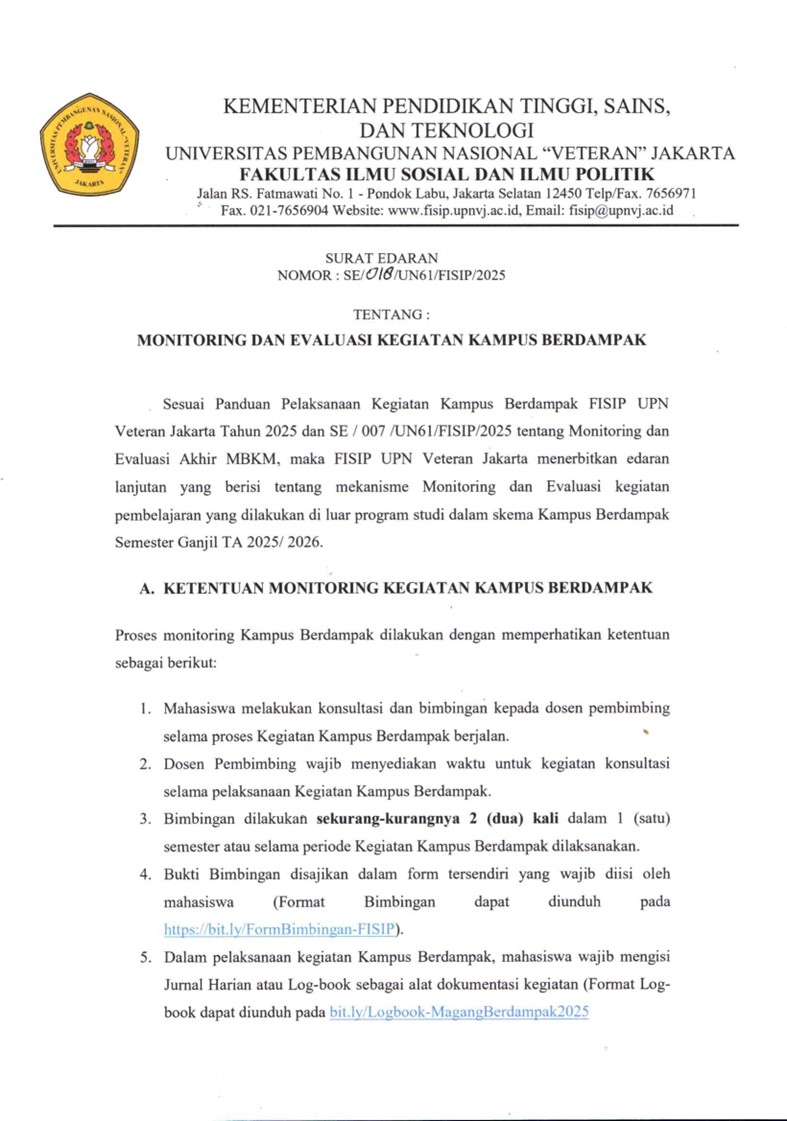 Sesuai Panduan Pelaksanaan Kegiatan Kampus Berdampak FISIP UPN “Veteran” Jakarta Tahun 2025 dan SE /007/UN61/FISIP/2025 tentang Monitoring dan Evaluasi Akhir MBKM, maka FISIP UPN “Veteran” Jakarta menerbitkan edaran lanjutan yang berisi tentang mekanisme Monitoring dan Evaluasi kegiatan pembelajaran yang dilakukan di luar program studi dalam skema Kampus Berdampak Semester Ganjil TA 2025/2026.