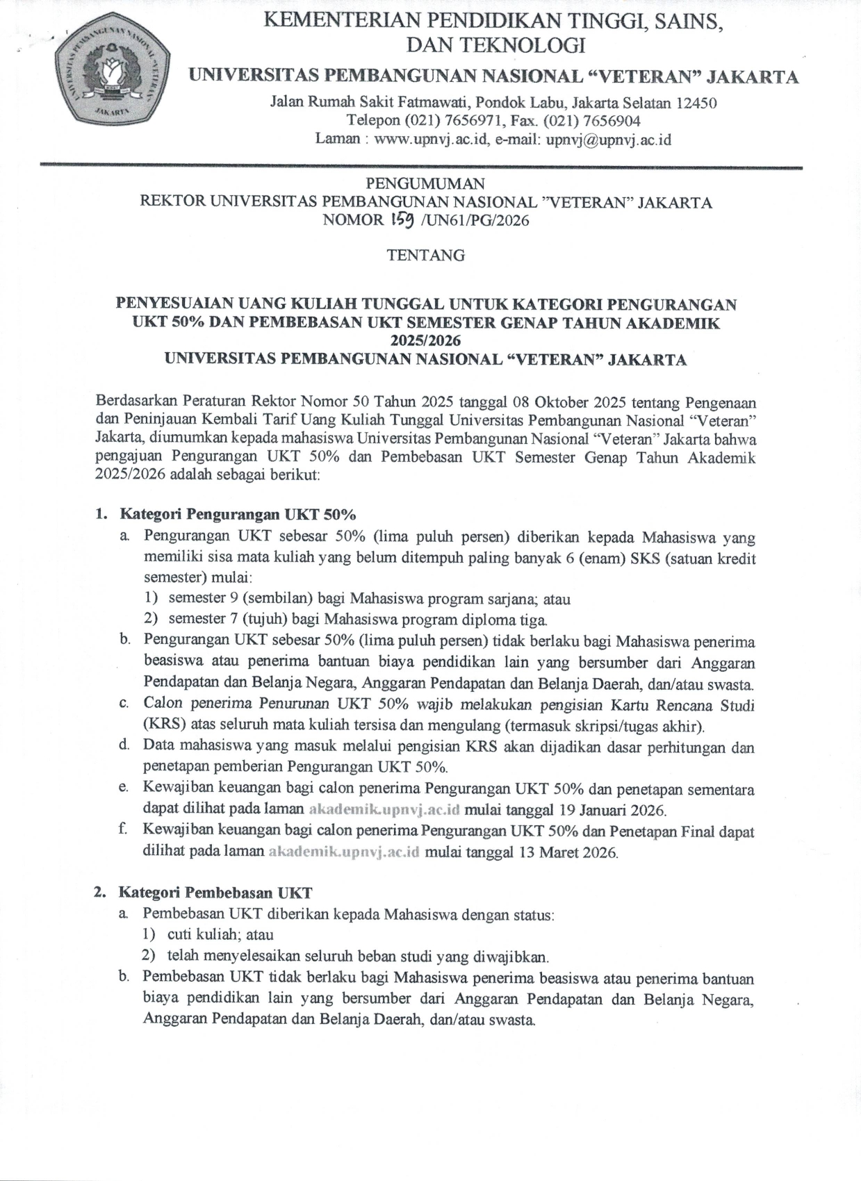 - Kewajiban keuangan bagi calon penerima Pengurangan UKT 50% dan penetapan sementara dapat dilihat pada laman akademik.upnvj.ac.id mulai tanggal 19 Januari 2026.