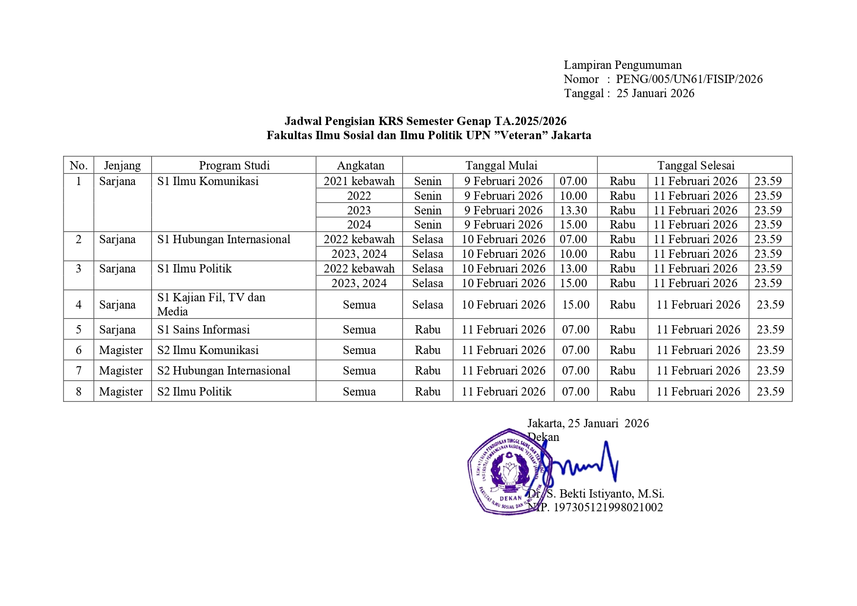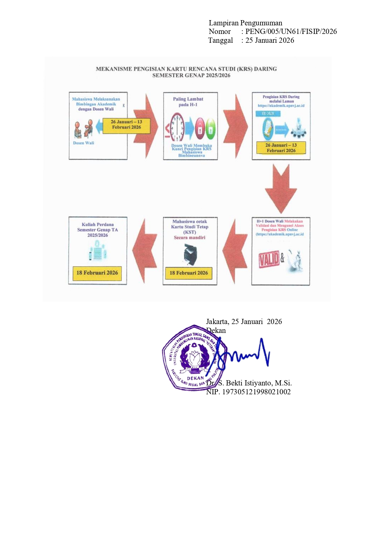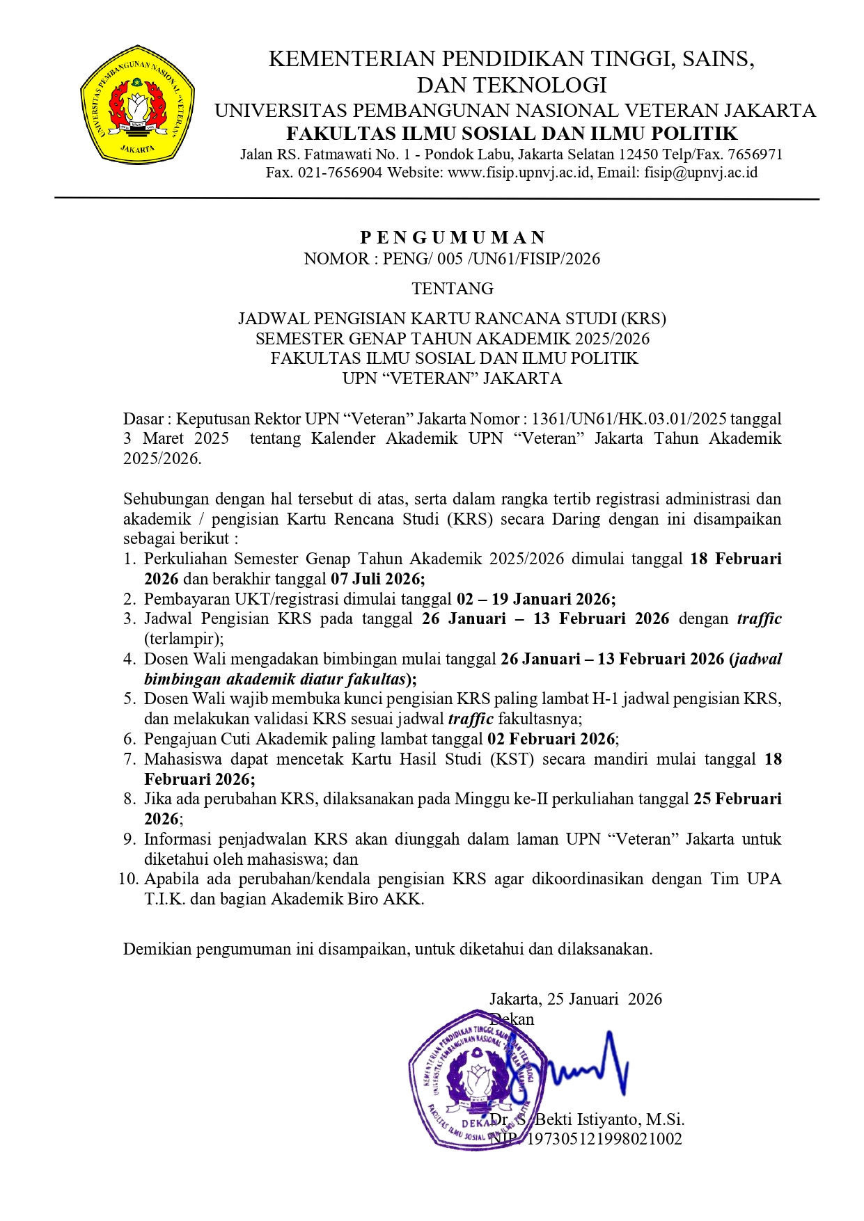 FisipUPNVJ – Sesuai dengan Kalender Akademik Universitas Pembangunan Nasional “Veteran” Jakarta TA 2025/2026, serta dalam rangka tertib registrasi administrasi dan akademik / pengisian Kartu Rencana Studi (KRS) dengan ini disampaikan: