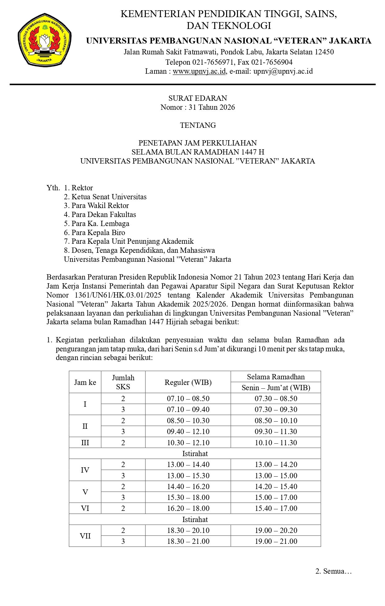 FisipUPNVJ – Kegiatan perkuliahan dilakukan penyesuaian waktu dan selama bulan Ramadhan ada pengurangan jam tatap muka, dari hari Senin s.d Jum’at dikurangi 10 menit per sks tatap muka, dengan rincian table diatas