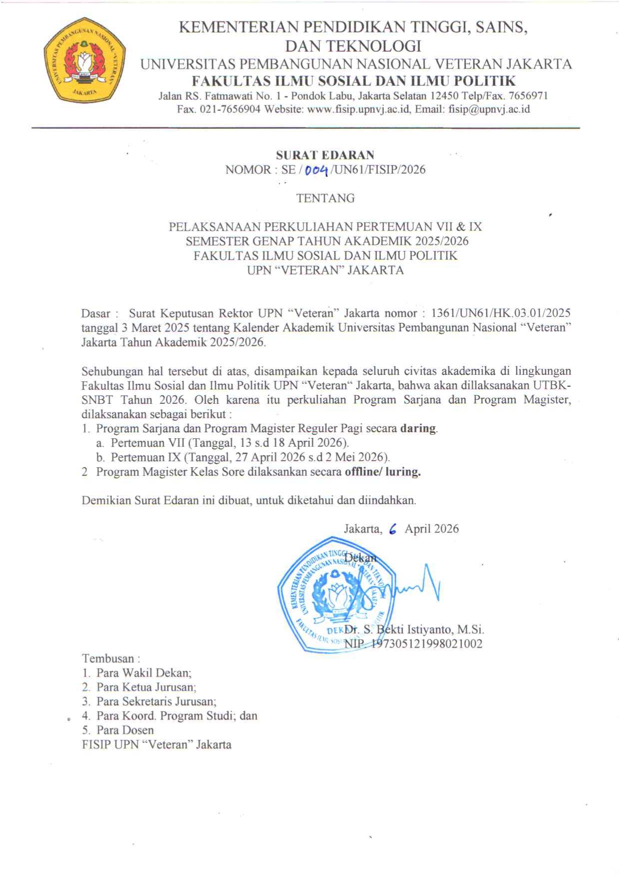 Sehubungan hal tersebut di atas, disampaikan kepada seluruh civitas akademika di lingkungan Fakultas Ilmu Sosial dan Ilmu Politik UPN “Veteran” Jakarta, bahwa akan dillaksanakan UTBK-SNBT Tahun 2026. Oleh karena itu perkuliahan Program Sarjana dan Program Magister, dilaksanakan sebagai berikut: