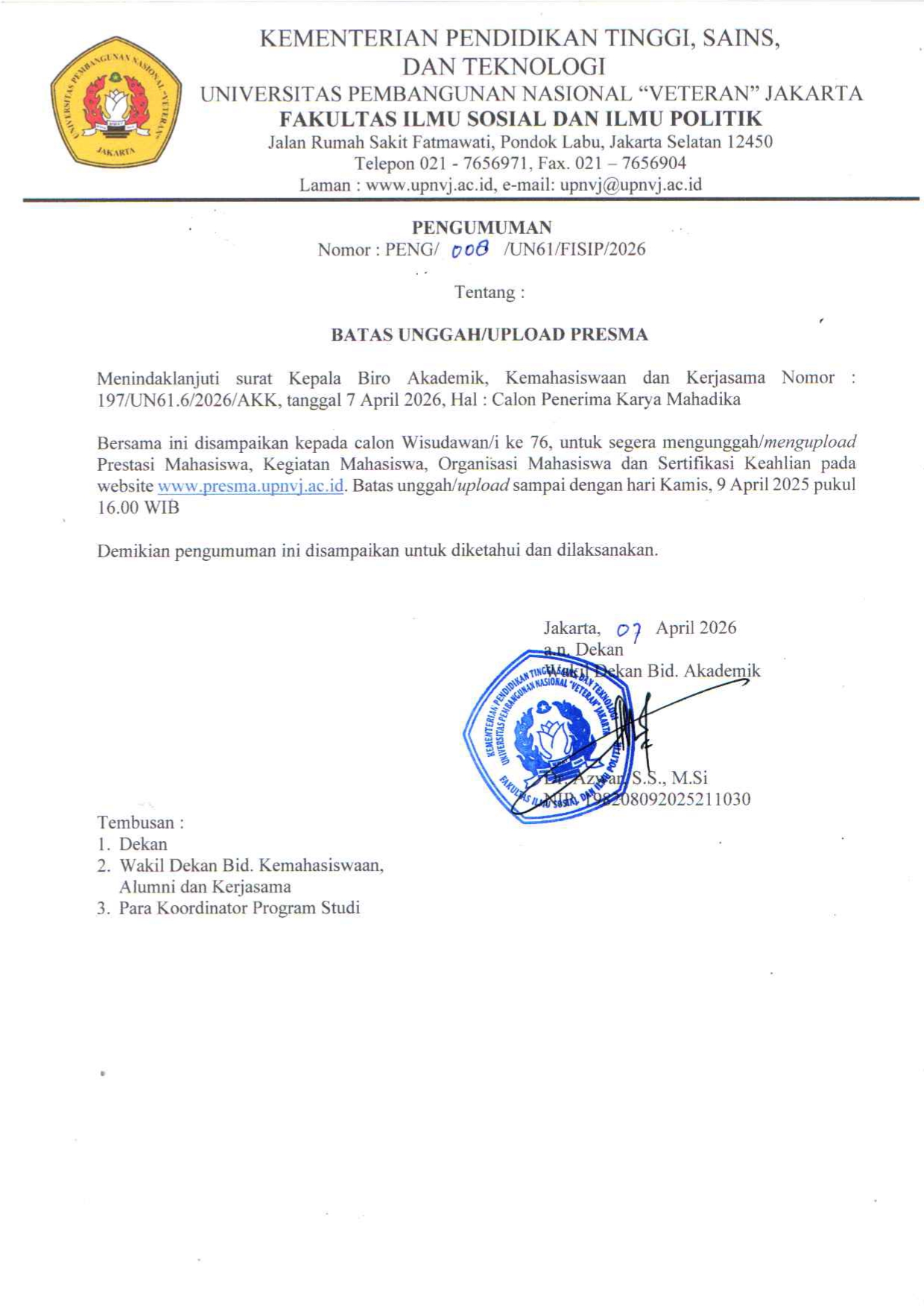 FisipUPNVJ – Menindaklanjuti surat Kepala Biro Akademik, Kemahasiswaan dan Kerjasama Nomor: 197/UN61.6/2026/AKK, tanggal 7 April 2026, Hal: Calon Penerima Karya Mahadika