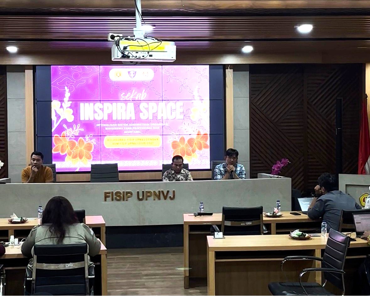 FisipUPNVJ – Fakultas Ilmu Sosial dan Ilmu Politik Universitas Pembangunan Nasional “Veteran” Jakarta (UPNVJ) bersama Badan Eksekutif Mahasiswa (BEM) FISIP UPNVJ menyelenggarakan kegiatan Inspira Space pada Rabu, 8 April 2026, bertempat di Auditorium Gedung M. Yamin FISIP UPNVJ. Kegiatan ini mengusung tema “Optimalisasi Sistem Administrasi Organisasi Mahasiswa yang Profesional dan Akuntabel” sebagai upaya memperkuat tata kelola organisasi mahasiswa di lingkungan FISIP.