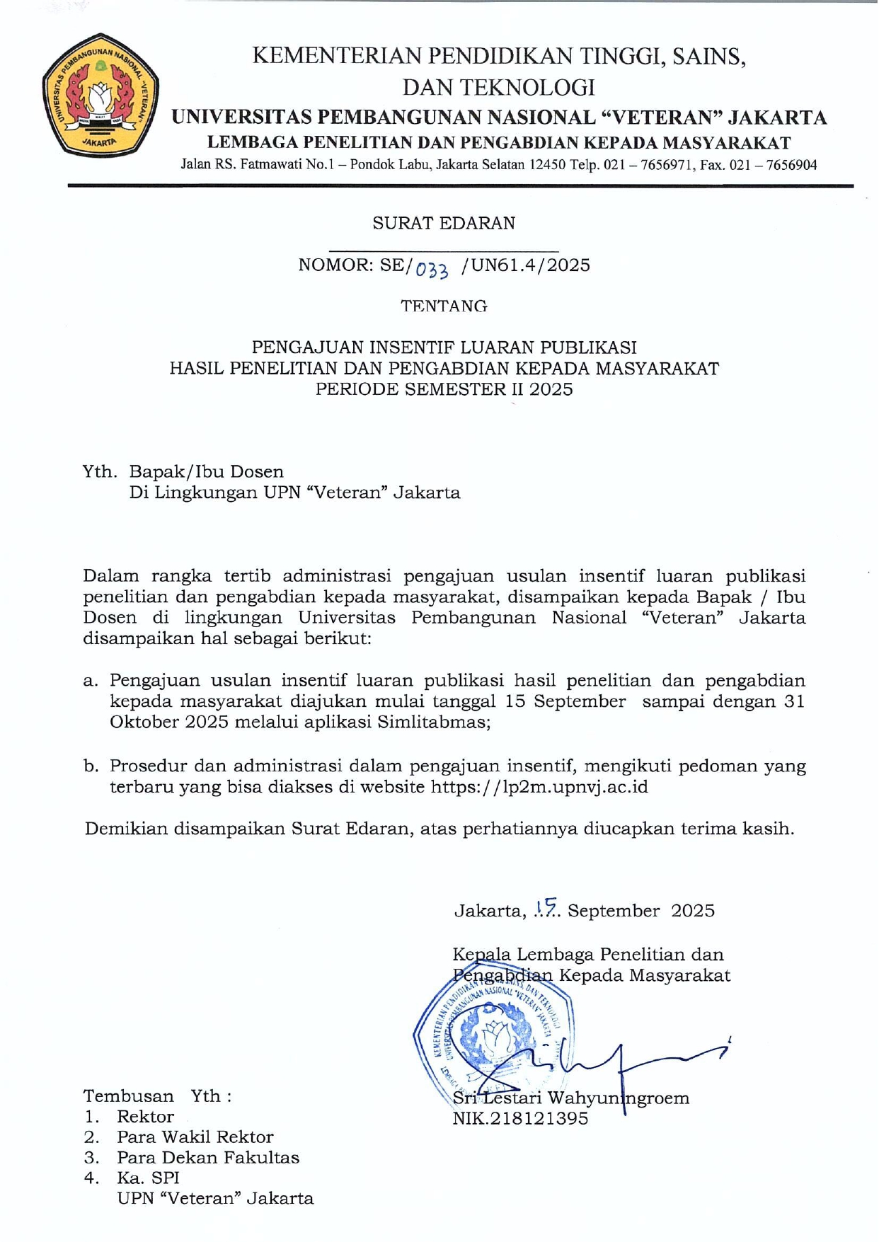 FisipUPNVJ-Dalam rangka tertib administrasi pengajuan usulan insentif luaran publikasi penelitian dan pengabdian kepada masyarakat, disampaikan kepada Bapak / Ibu Dosen di lingkungan Universitas Pembangunan Naslonal “Veteran” Jakarta disampaikan hal...