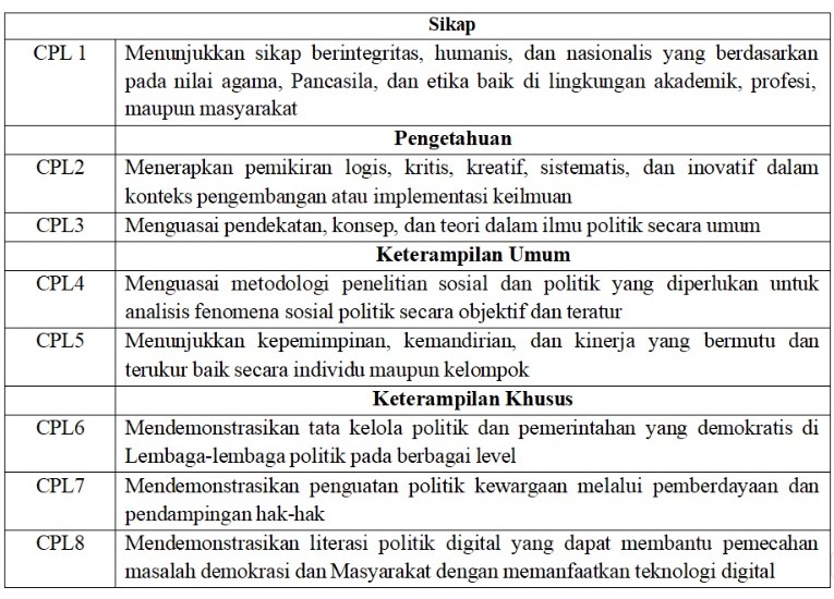 - Menyelenggarakan pendidikan di bidang Ilmu Politik yang berbasis pada kajian politik pemerintahan, politik kewargaan, dan politik digital, yang berwawasan lokal, nasional, dan global;